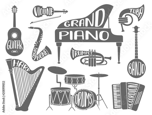 Set Of Musical Instruments With Lettering With The Names Of Theinstruments Piano Gutar Violin Drums Isolated On A Wite Background Buy This Stock Vector And Explore Similar Vectors At Adobe Stock Indian Musical Instrument Wikipedia